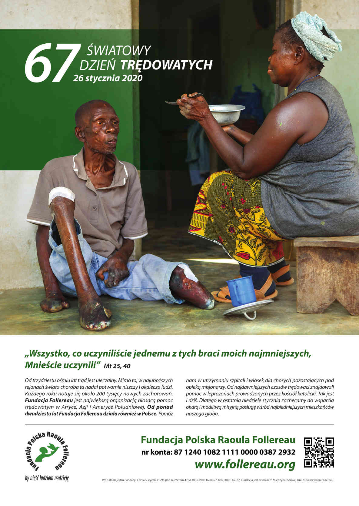 Od trzydziesty ośmiu lat trąd jest uleczalny. Mimo to, w najuboższych rejonach świata choroba ta nadal potwornie niszczy i okalecza ludzi. Każdego roku notuje się około 200 tysięcy nowych zachorowań. Fundacja Follereau jest największą organizacją niosącą pomoc trędowatym w Afryce, Azji i Ameryce Południowej. Od ponad dwudziesty lat Fundacja Follereau działa również w Polsce. Pomóż nam w utrzymaniu szpitali i wiosek dla chorych pozostających pod opieką misjonarzy. Od najdawniejszych czasów trędowaci znajdowali pomoc w leprozariach prowadzonych przez kościół katolicki. Tak jest i dziś. Dlatego w ostatnią niedzielę stycznia zachęcamy do wsparcia ofiarą i modlitwą misyjną posługę wśród najbiedniejszych mieszkańców naszego globu.