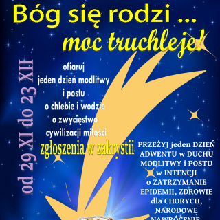 W zakrystii możemy się zgłaszać do przeżycia wybranego przez siebie jednego dnia postu o chlebie i wodzie w czasie adwentu w intencji o zatrzymanie epidemii, zdrowie dla chorych, narodowe nawrócenie i pokój w Ojczyźnie.