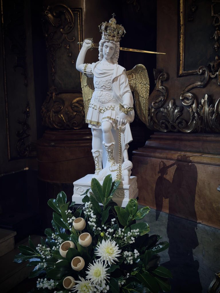 Przy ołtarzu wystawiona jest figura św. Michała Archanioła z sanktuarium ku jego czci w Mont San Angelo we Włoszech, którą zakupiliśmy podczas parafialnej pielgrzymki w lipcu tego roku.