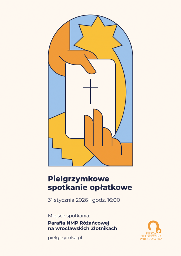 W tym roku spotkamy się w sobotę 31 stycznia o godzinie 16:00 w kościele Matki Bożej Różańcowej przy ul. Wielkopolskiej 5 na wrocławskich Złotnikach. Nasze spotkanie rozpocznie się Mszą Świętą pod przewodnictwem biskupa Macieja Małygi. Po niej przejdziemy Złotnickiego Centrum Spotkań, które sąsiaduje z kościołem. Tam podzielimy się opłatkiem we wspólnocie pielgrzymów, pielgrzymów duchowych, sympatyków pielgrzymki i wolontariuszy. Następnie czeka nas wspólne kolędowanie i poczęstunek.