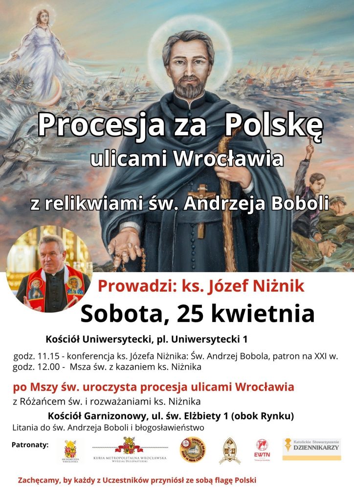 W sobotę 25 kwietnia zapraszamy do udziału w procesji różańcowej z relikwiami św. Andrzeja Boboli w intencji naszej Ojczyzny – Polski. Początek w naszym kościele o godz. 11:15 konferencją ks. Józefa Niżnika, następnie o godz. 12:00 Msza św. i po niej procesja różańcowa z rozważaniami ks. Niżnika do kościoła garnizonowego św. Elżbiety i tam zakończenie procesji Litanią ku czci św. Andrzeja Boboli. Zabierzmy ze sobą biało-czerwone flagi. Szczegóły na plakacie.